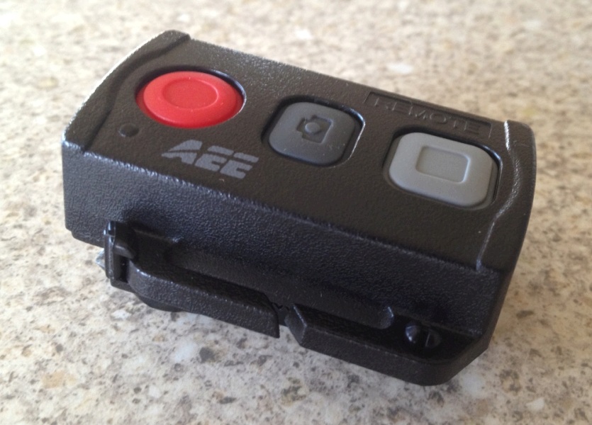 Now here's a useful inclusion. A wireless remote control - wifi, not infrared. You pair this with the camera (in fact you can pair it to several) and hence have control of recording, snapping photos, or activating the laser to check alignment when the camera is out of reach. Handy if the camera is mounted outside your glider (in my case) or other form of transportation. The remote has clips on either side for you to thread a strap through if you want to wrist mount it, and also has a removable alligator style clamp to attach it to a sleeve, collar, pocket or whatever. I guess you could use that included velcro to mount it to a cockpit wall or dashboard or whatever. An indicator LED shows when a control has been pressed, and you get (loud) audio feedback from the camera as well. Just to rub it in with GoPro some more, with all but the highest spec GoPro3 Black, you have to dish out an additional $99 for a similar remote, and if you have an older gen 1 or 2 camera you'll need to shell out another $90 for a wifi backpack to use it. The newer ones have wifi built in. Granted, the GoPro wifi does let you use a nifty smartphone app to as a viewfinder and to change menu settings, I don't see this as being a feature on the AEE camera anytime soon.